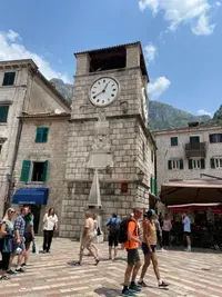 Het uitzicht tijdens de tocht was indrukwekkend met alle bergen. Na meer dan een uur moesten we zigzaggend een berg afdalen. Dat was voordat we bij Budva waren en in de verte kon je het oude centrum zien. Wij moesten verder richting Kotor. Vlak voor Kotor is een lange tunnel en helaas was er een file. Het duurde en duurde en we gingen langzaam vooruit. Milos belde regelmatig en de boot zou vast zonder ons vertrekken. 2,5 uur later waren we in Kotor en in de haven. Milos belde met zijn chef en die kreeg ik aan de lijn. Of het okay was om nu de stad van Kotor in te gaan en dan om 15.00 uur met de boot te gaan. Klinkt als een goed plan. Milos liep een stuk mee richting het oude centrum en door de vestigingsmuren bij een pleintje meteen klok. 14.30 uur zou ik hem daar weer ontmoeten.
