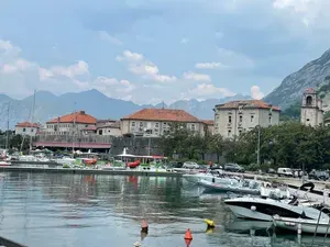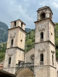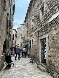 Op een van de pleintjes heb ik gegeten; zwarte risotto met inktvis. De prijs met een drankje was €17,-- Voor het land echt toeristenprijzen. Tijdens het struinen in het oude centrum van Kotor nog een postkaart gekocht om naar vrienden met kinderen te versturen. Ondanks de bewolking was het erg warm die dag maar ben toch nog een stadsmuur opgeklommen via een stenen pad dat ongelijke treden had en zag een schattig kitten onderweg. In Kotor zag je veel katten en in de toeristenwinkels hadden ze hier een handelsmerk van gemaakt. Ook viel het mij op dat er allemaal kerkjes waren in een relatief klein gebied.