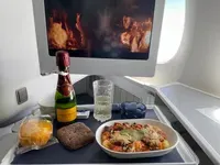 De stewardess overhandigde warme handdoekjes in de business en haalde deze ook weer op. Eenmaal op de juiste hoogte, werd een warme maaltijd geserveerd. Dit was een vegetarische gnocchi, keuze uit een broodje(ik kan je het donkere brood aanraden) en een muffin. Ik miste wel een salade bij de maaltijd.